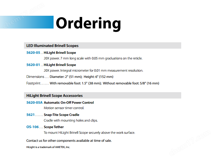 Newage 測試儀器在HiLight布氏光學放大鏡中使用 *的布氏範圍構架方式。HiLight使用內置、高效的 LED光源對布氏壓痕進行照明。LED的安裝位置非常理 想,可以得到清晰*的布氏壓痕的邊緣圖片。HiLight 光學鏡布氏硬度計