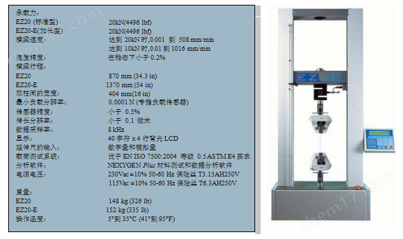 先進的EZ20萬能材料試驗機適用於上限達20 kN(4496 lbf)的較複雜和常規的測試應用。標準機型EZ20具備上限行程達870 mm(34.3 in)的雙柱 設計。EZ20 20kN萬能材料試驗機
